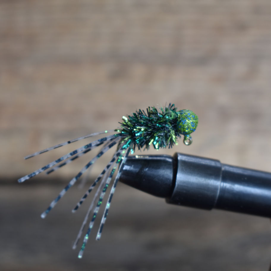 Crappie Thunder was created using a Chartreuse Teal Razzle Dazzle powder-painted round jig head, Black Crappie crystal antron, with Tennessee Batfish crazy legs.
