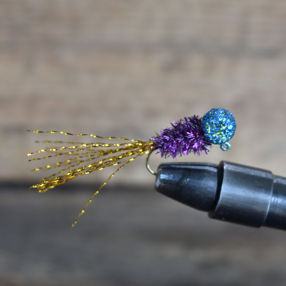 Mardi Gras was created using a Blue Chartreuse Stone powder-painted flat jig head, June Bug crystal antron, with a gold tinsel tail.